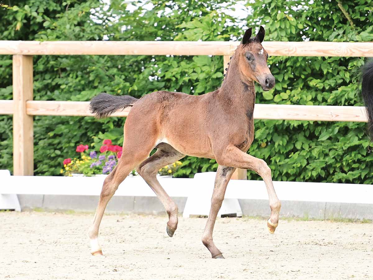 Die Escamillo-Tochter HP Enchanted glänzt im noblen Outfit mit schwungvollen Bewegungen. Überaus edel und typschön präsentiert sich diese Ballerina als etwas ganz Besonderes. Eine strahlende Perle für Zucht und Sport. HP Enchanted ist in Begleitung einer Trägerstute. Mutter Blossom ist die Schwester von zwei gekörten Hengsten: Vincello und Valentino, beide v. Vitalis. Großmutter A la Fasine ist die Schwester des gekörten Fasino v. Foundation. Die dritte Mutter ist keine Geringere als die Oldenburger Siegerstute, Bundeschampionesse der sechsjährigen Dressurpferde und S-Siegerin Fasine OLD. Fasine OLD ist die Schwester von zehn gekörten Hengsten, darunter Starvererber wie For Romance I und II, Viva Romance PS, Feinrich, Golden Romance, uvm.